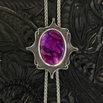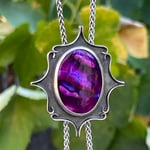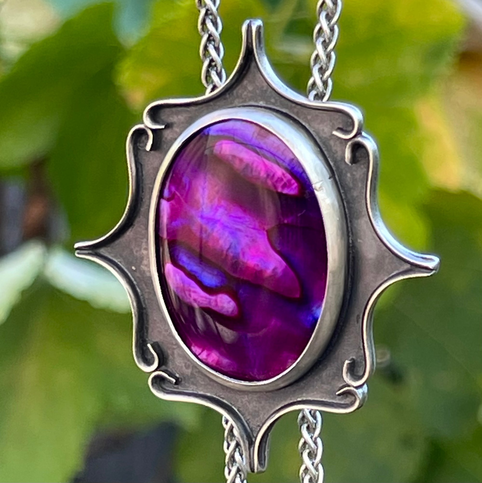 Vibrant purple abalone set in fine and sterling silver with hand formed wire designs. Stainless steel wheat chain that is slide adjustable.