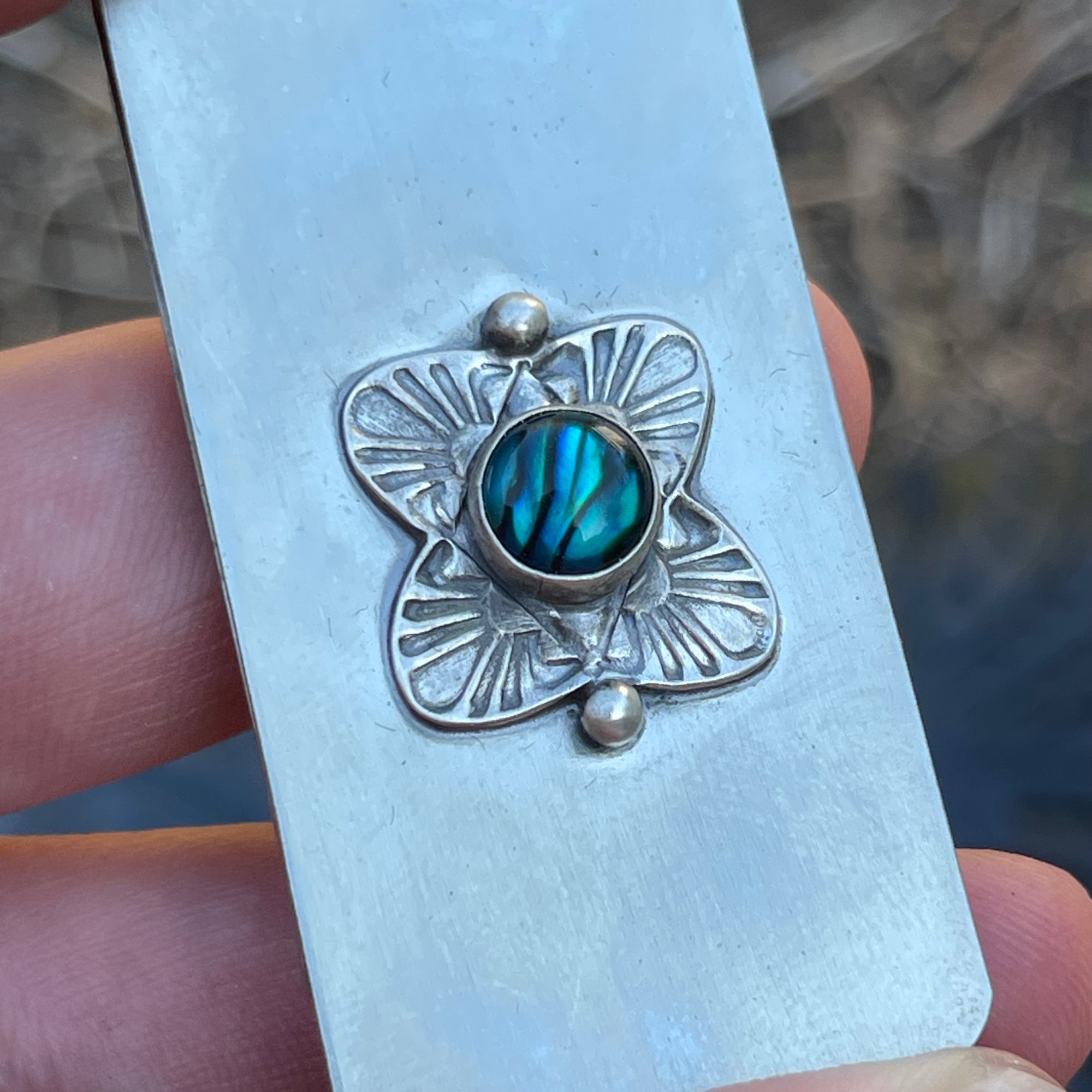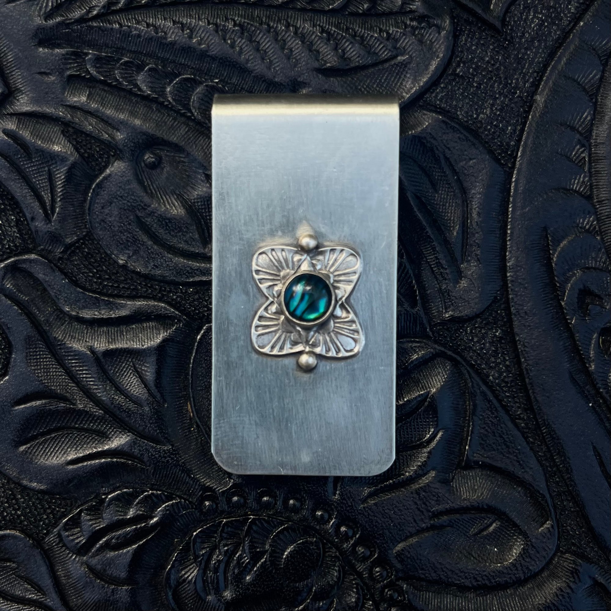 Abalone set in fine silver with hand stamped sterling silver designs soldered to a nickel money clip.