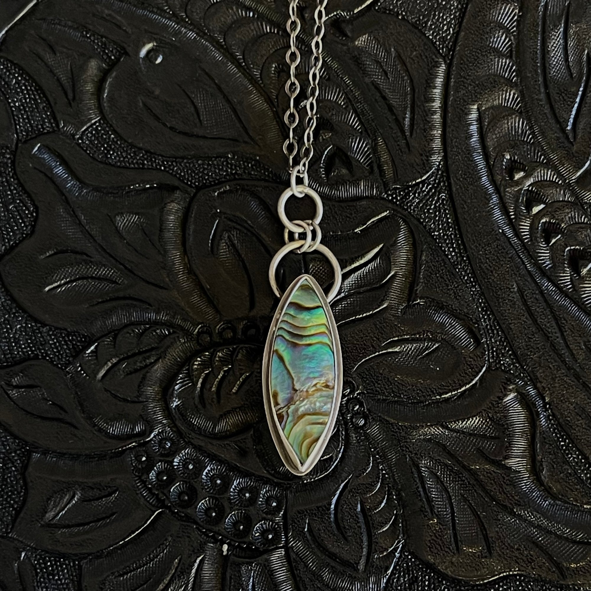 1.25" tall abalone set in fine silver with a sterling silver backplate and bail. Hangs on a 16" sterling cable chain.