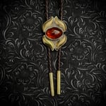 Glowing amber cabochon set in fine silver bezel, framed by brass bump out stamp designs. Handmade brass bolo tips and a dark brown leather chord.