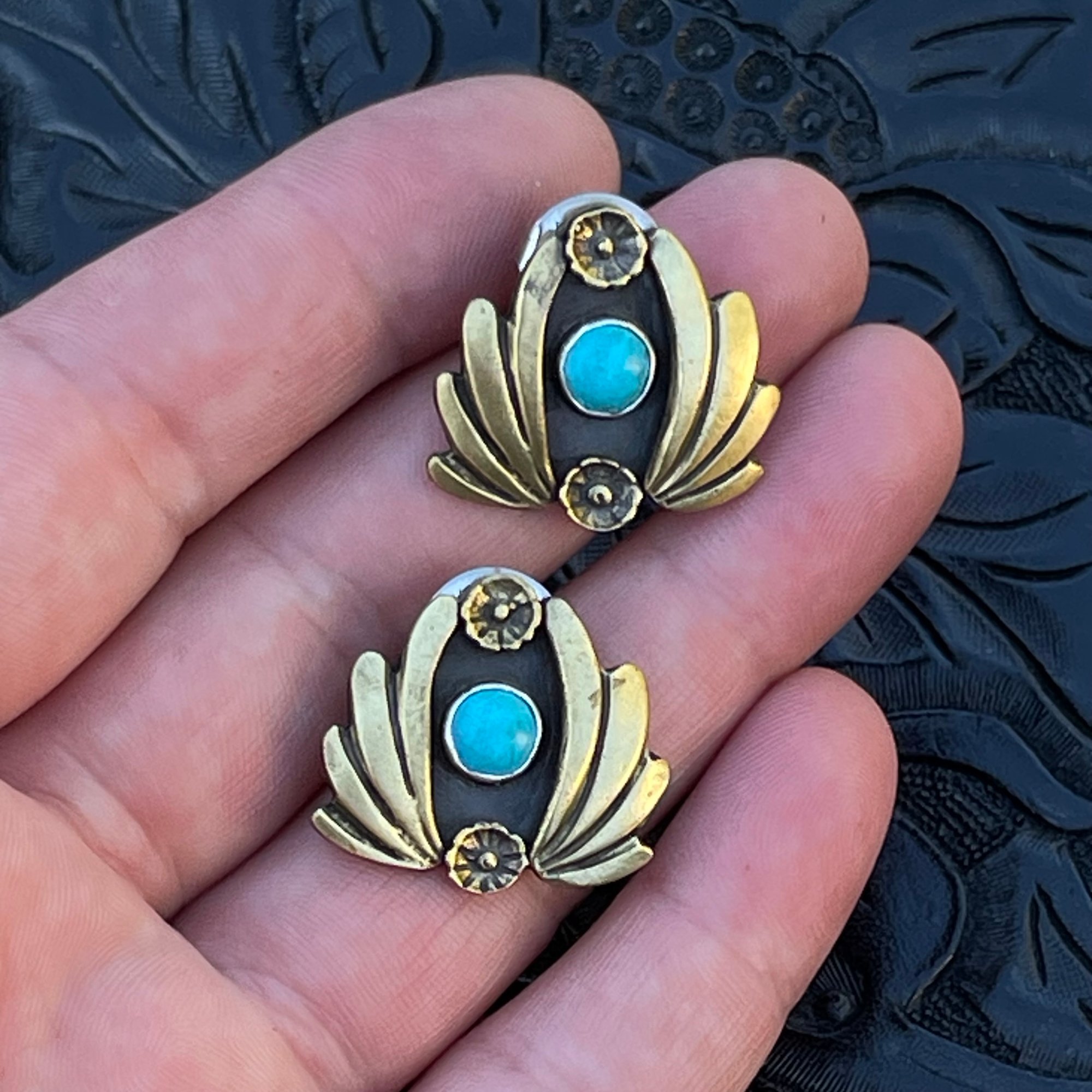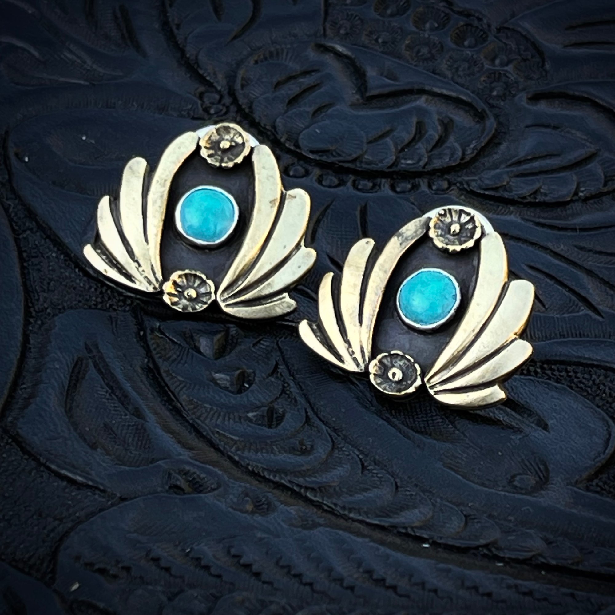 Turquoise set in fine silver with brass casting designs and backplates. Sterling silver ear posts/backs.