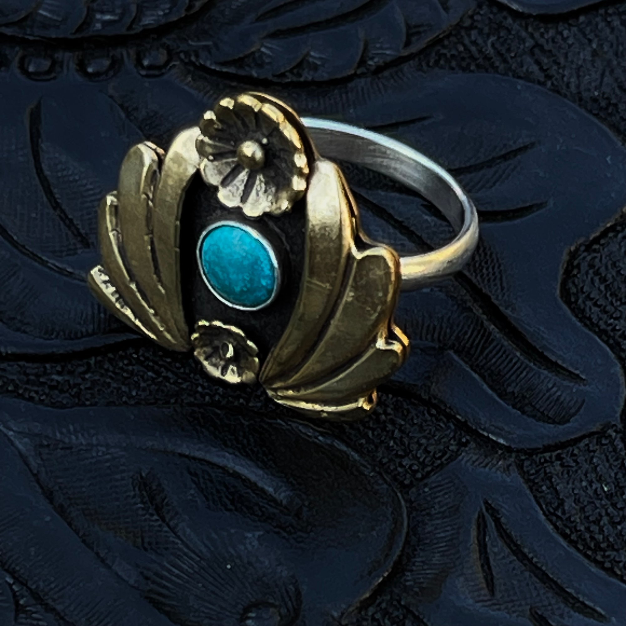 Turquoise set in fine silver with brass casting designs and backplate. Solid sterling silver band, size 8.