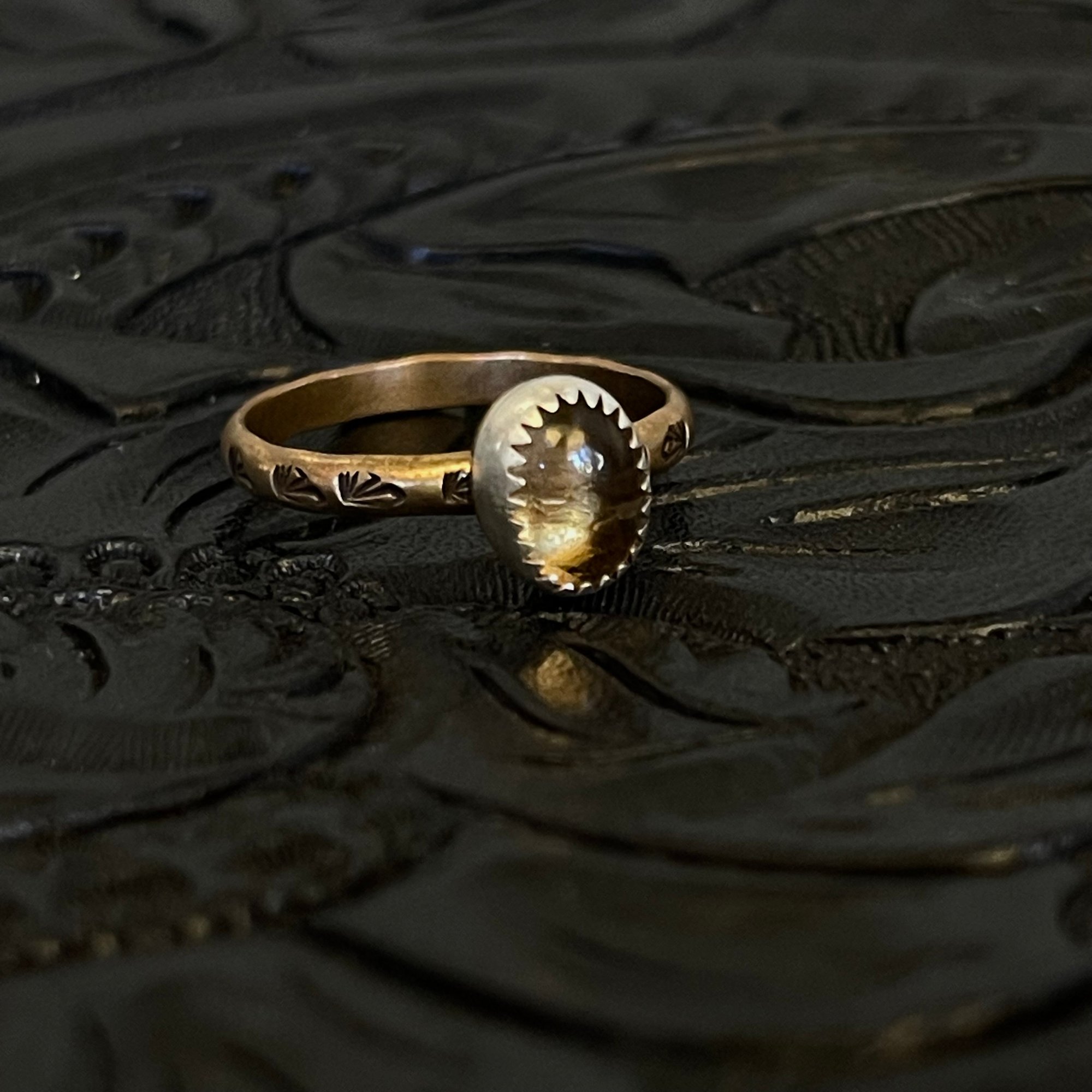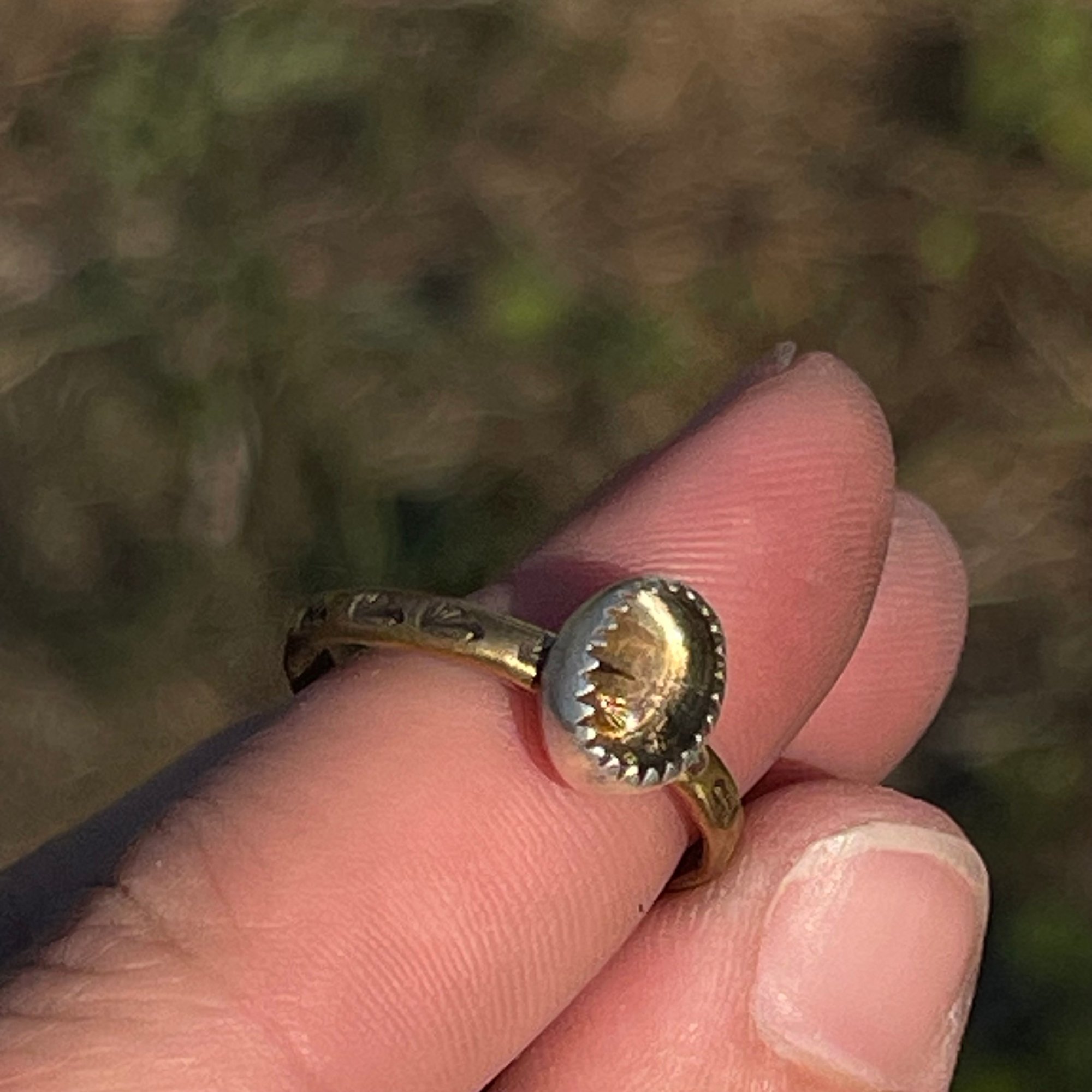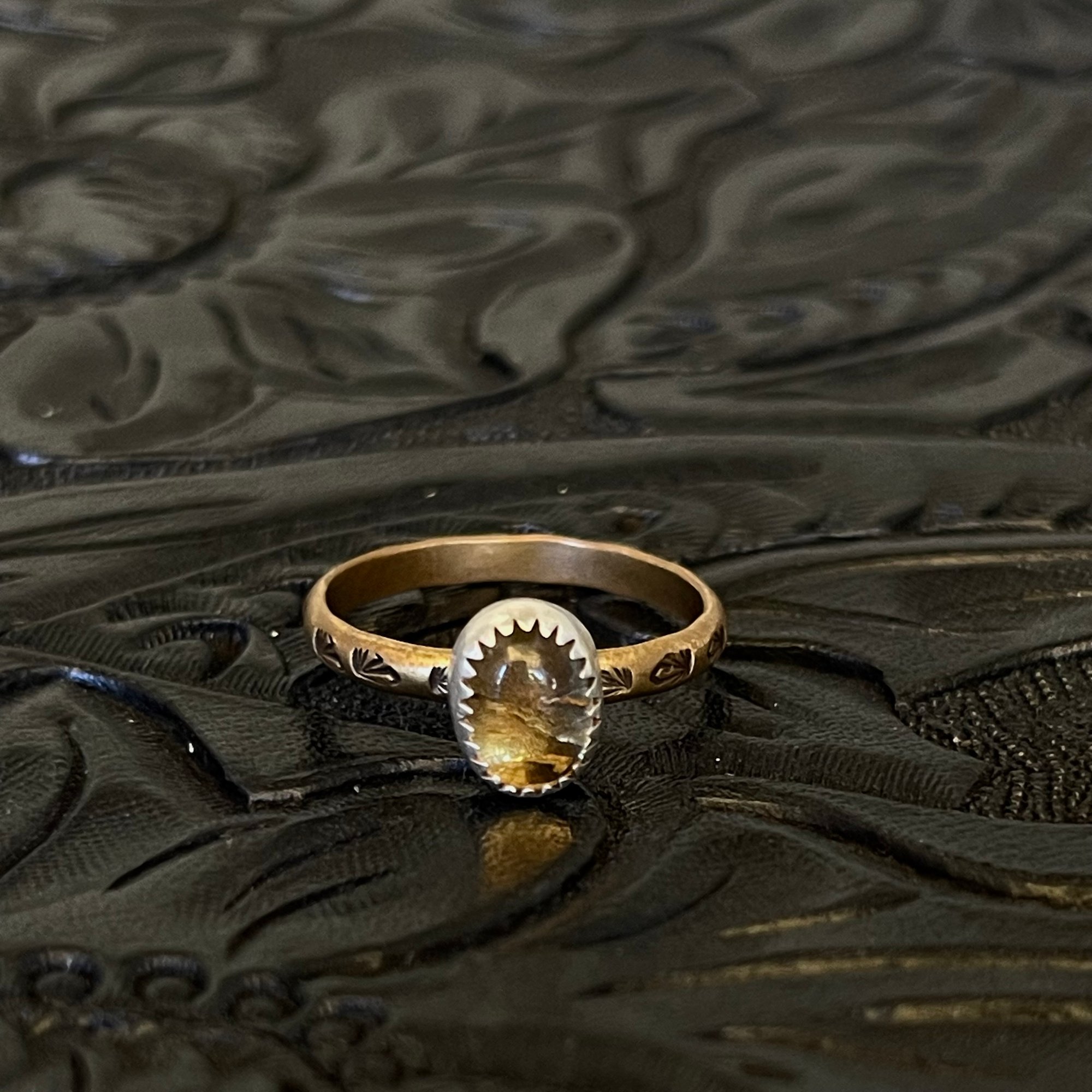 Citrine set in a fine silver bezel with hand stamped brass band. Size 7.5