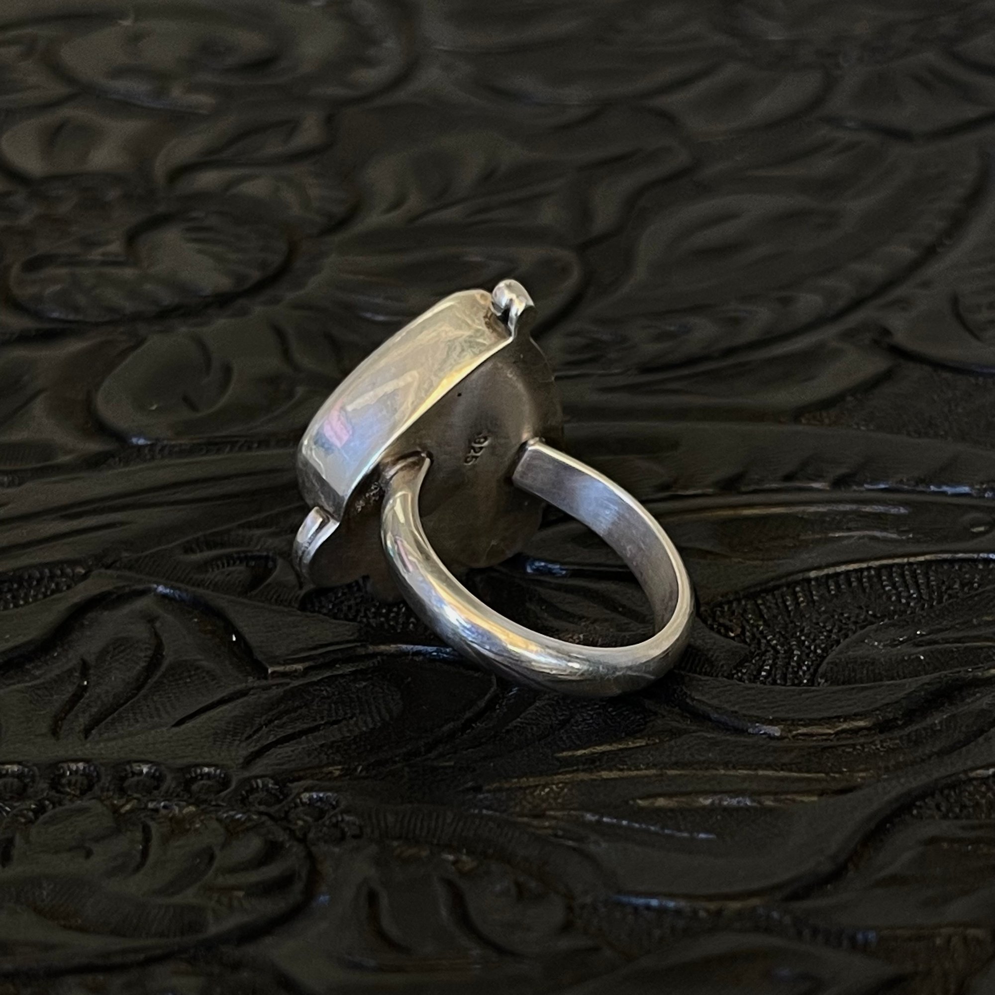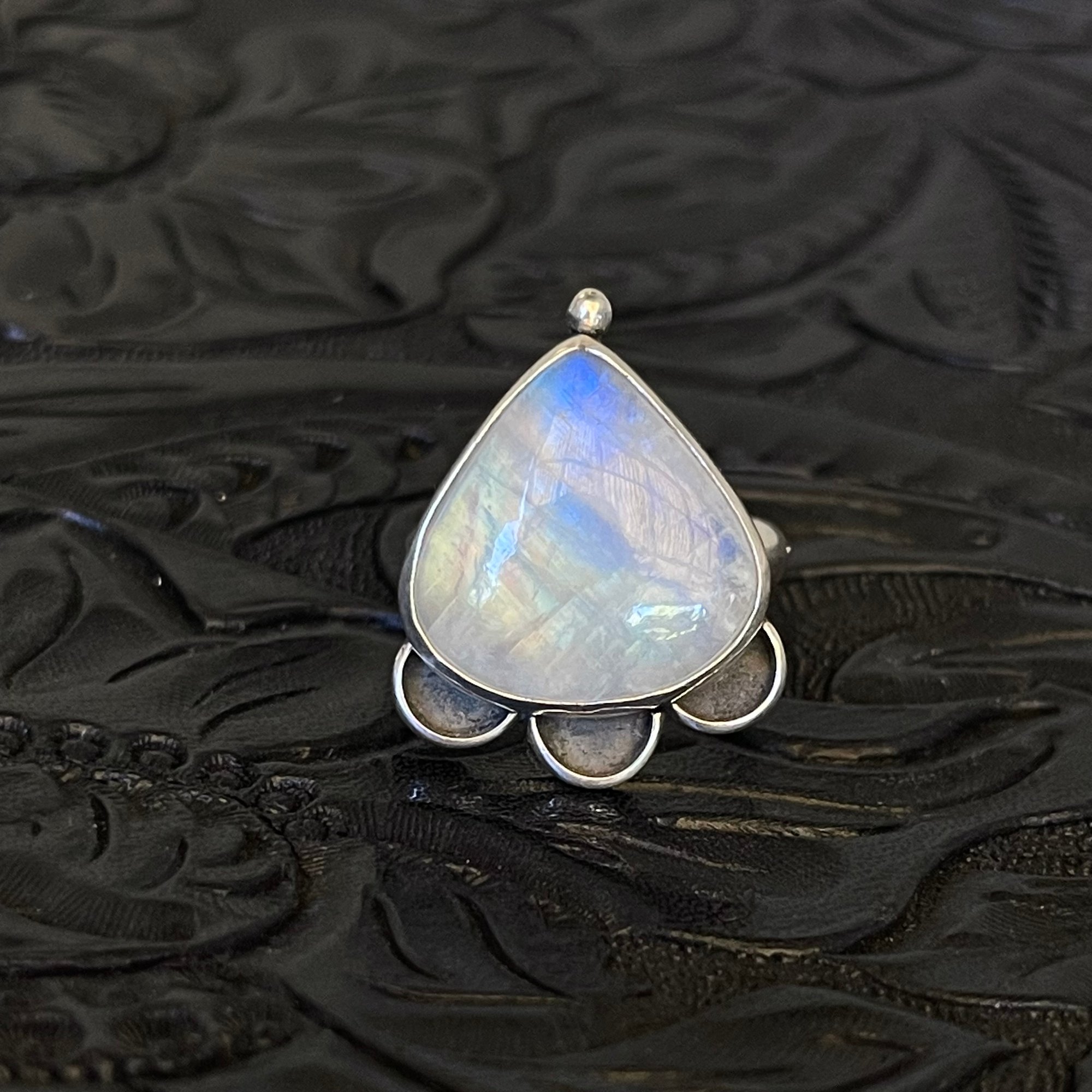 Flashy, chunky moonstone set in a fine silver bezel soldered to a solid sterling backplate with sterling wire designs and a solid band. Size 7.75.