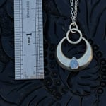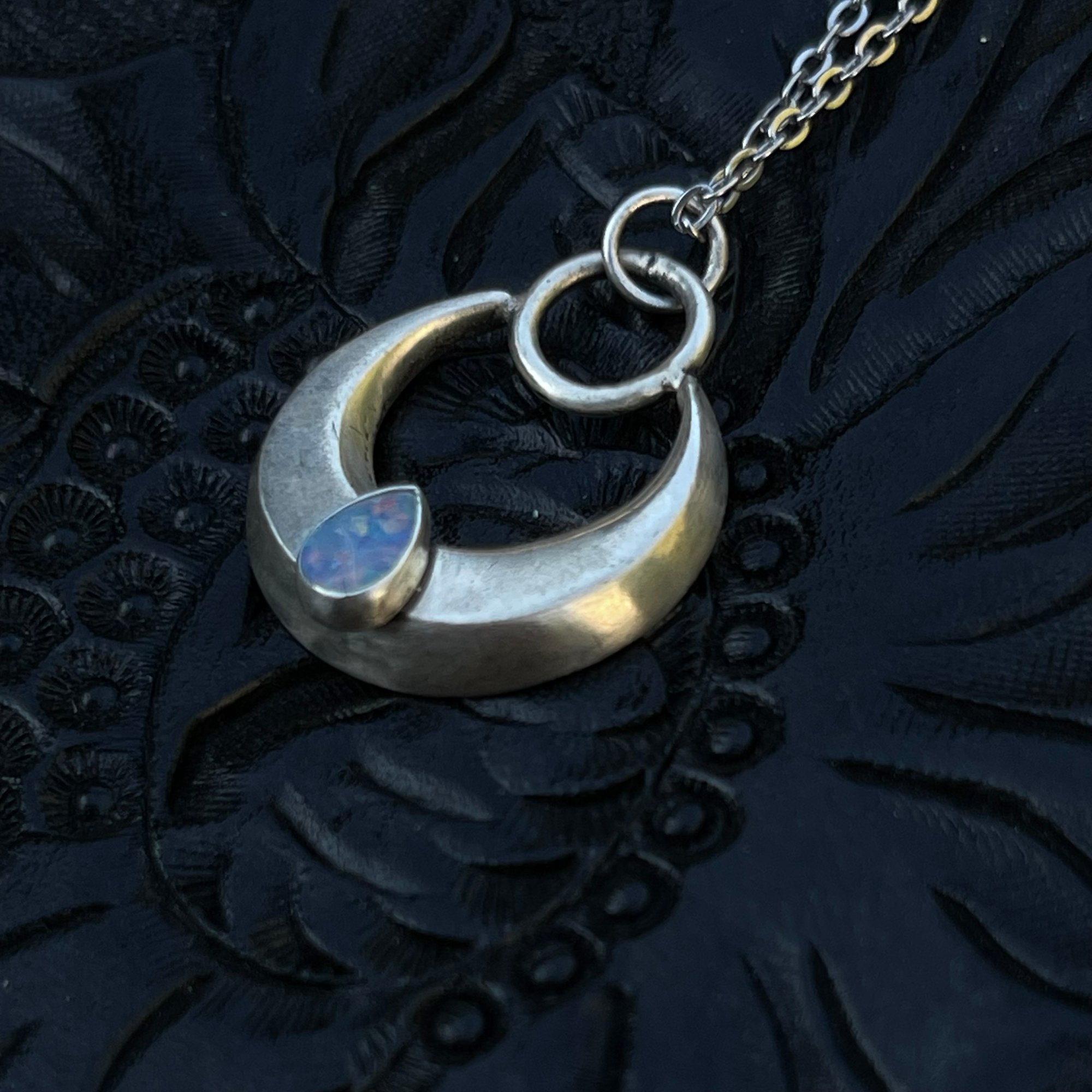 Australian opal set in a fine silver bezel soldered to a solid sterling crescent moon, originally hand carved in wax and then sand cast. Hangs on a 19" stainless steel cable chain.