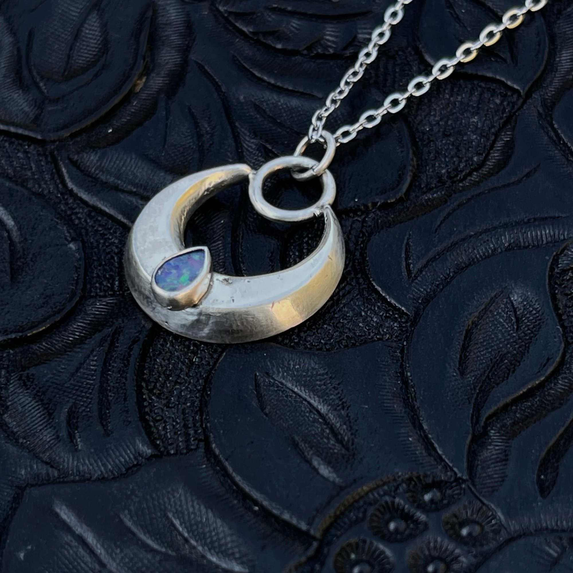 Australian opal set in a fine silver bezel soldered to a solid sterling crescent moon, originally hand carved in wax and then sand cast. Hangs on a 20" stainless steel cable chain.