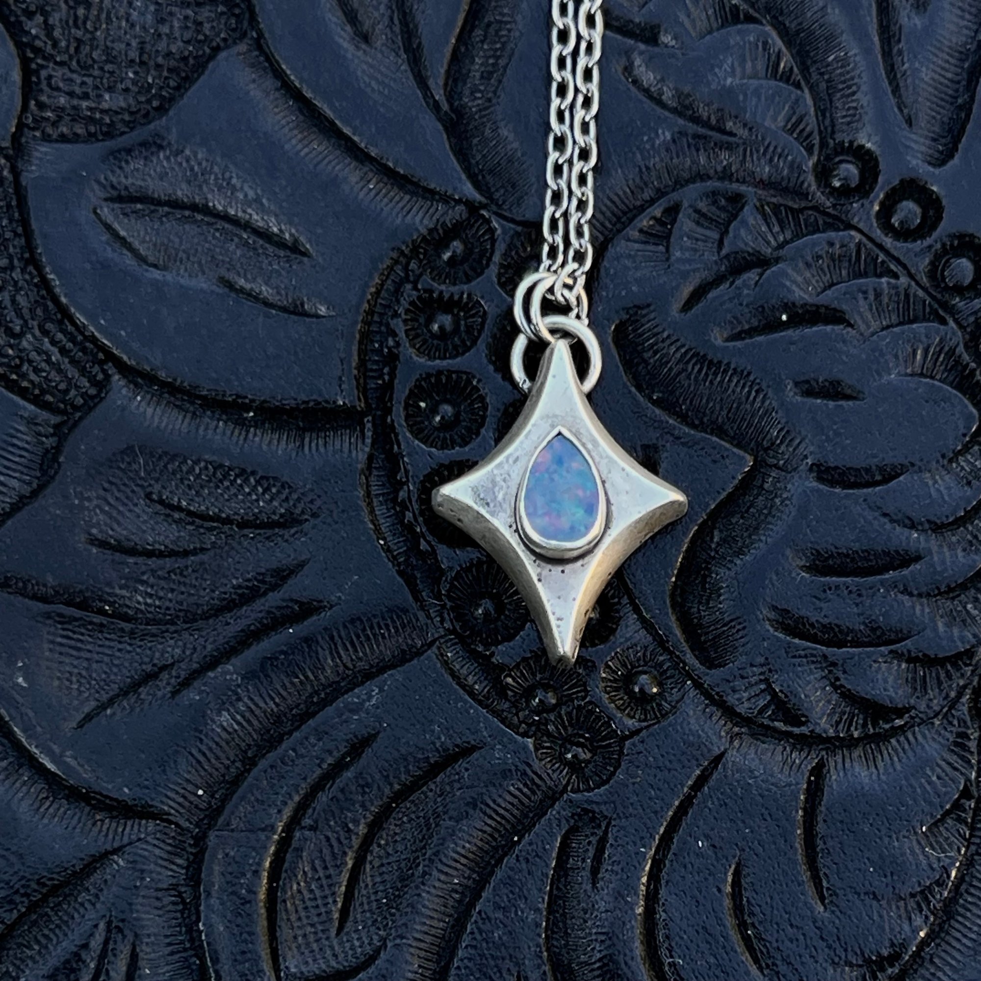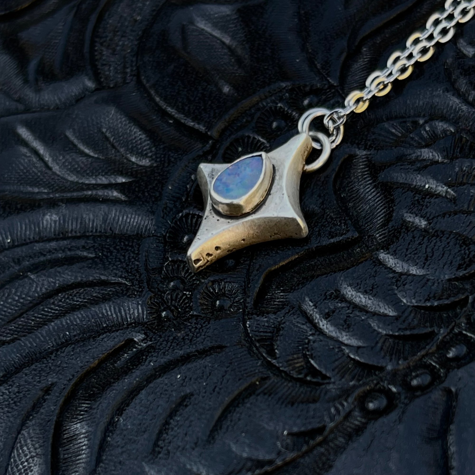 Australian opal set in a fine silver bezel soldered to a sterling star shape, originally hand carved in wax and then sand cast. Hangs on a 19" stainless steel cable chain.