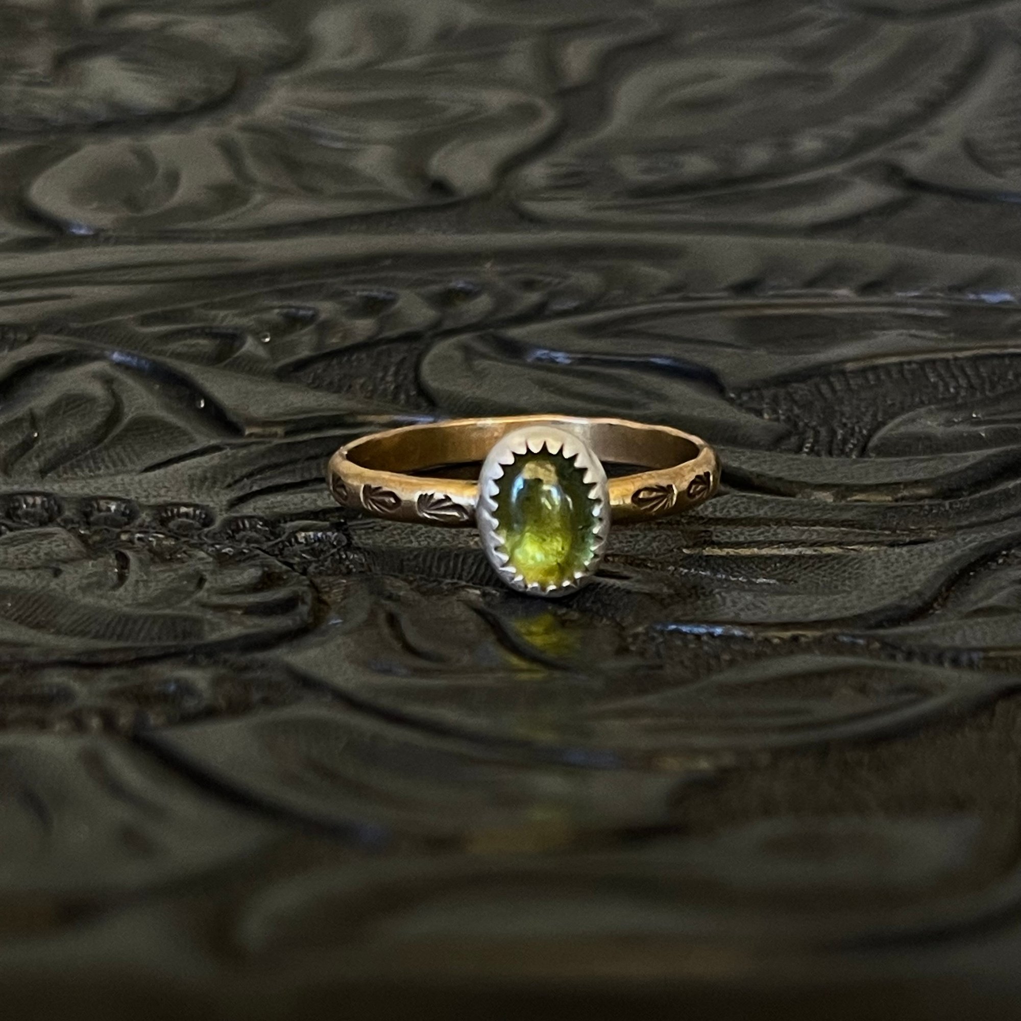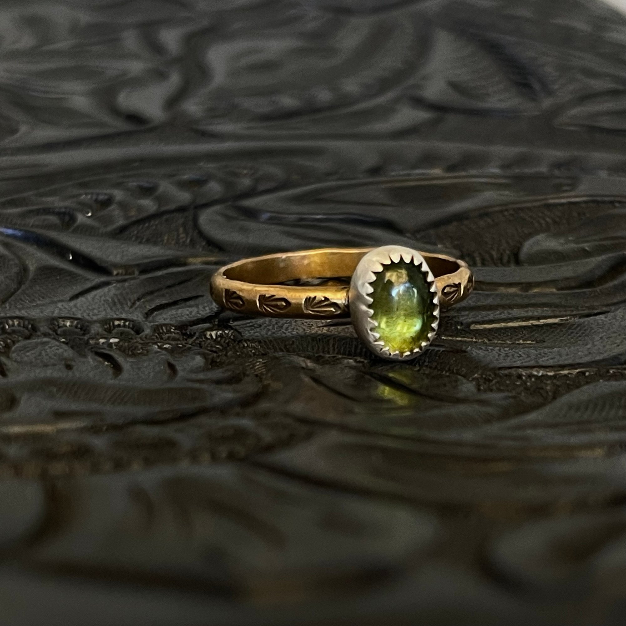 Peridot set in fine silver with a hand stamped brass band, size 9.