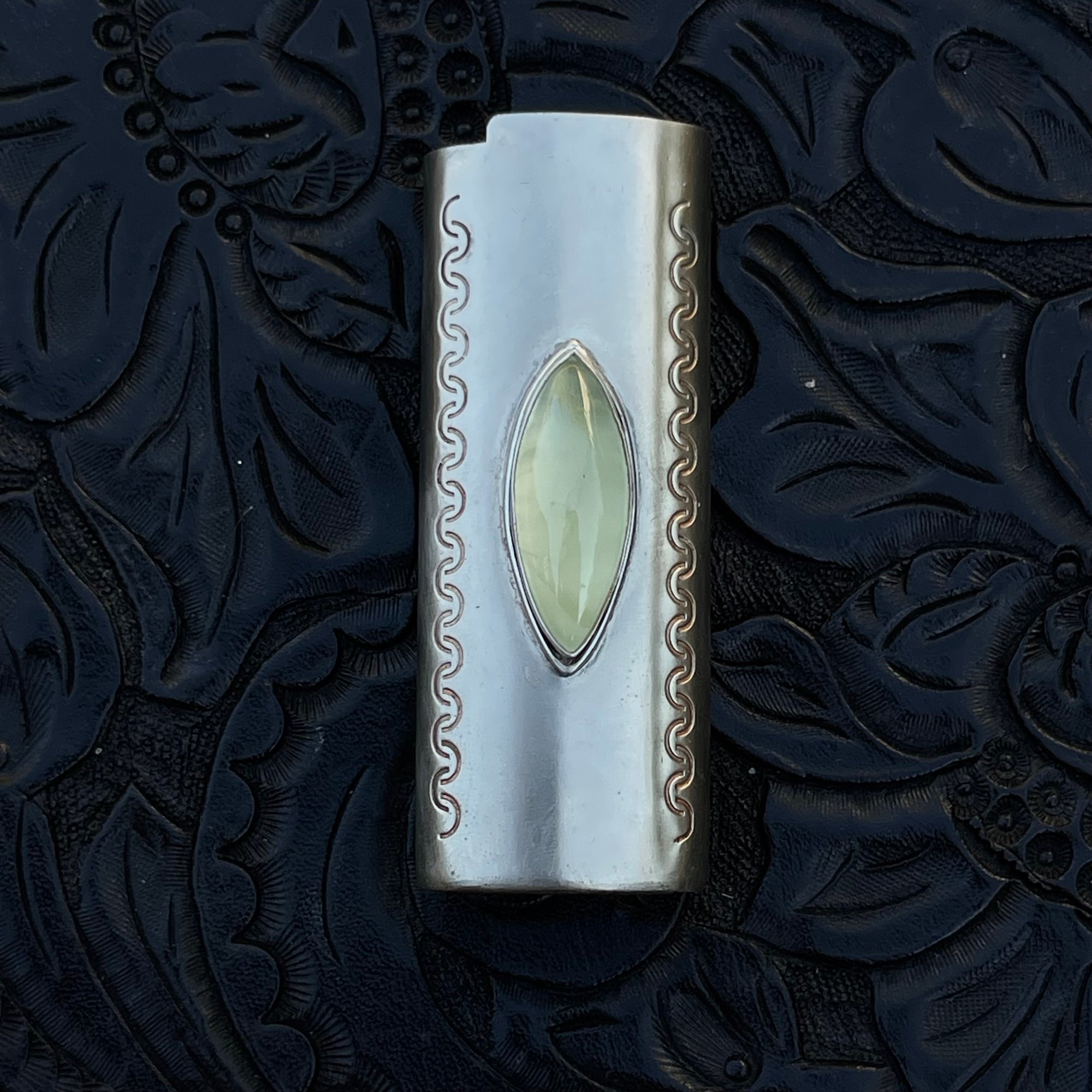 Prehnite gemstone set in fine and sterling silver bezel soldered onto a nickel lighter case.