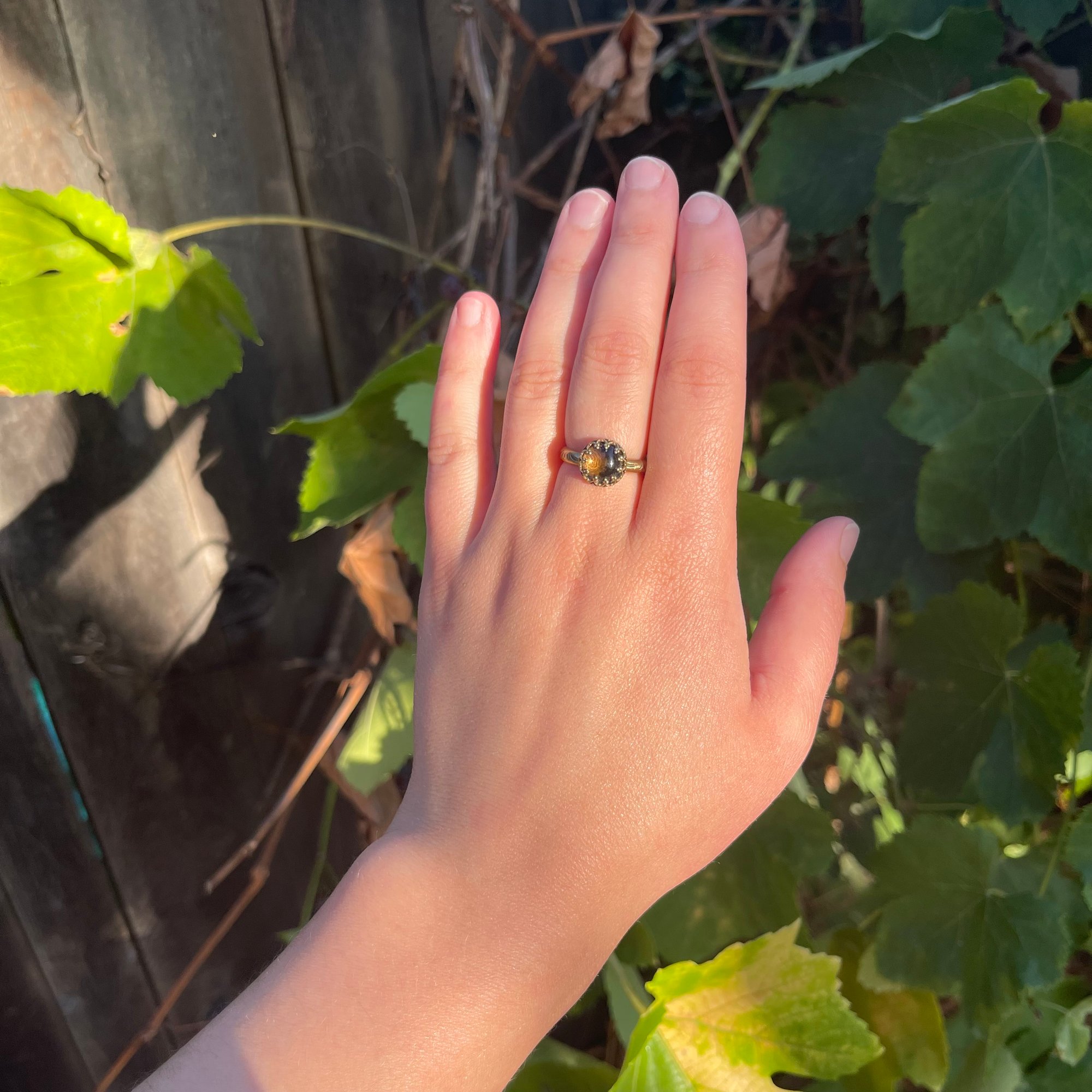 Smokey quartz set in brass gallery wire with a hand stamped brass band. Size 7.